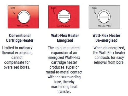 Unlike conventional cartridge heaters, the split-sheath construction of Watt-Flex expands when energized to create intimate contact with the bore and contracts when de-energized for effortless removal. This design eliminates air gaps, improves heat transfer, and reduces the risk of seizure after long service.